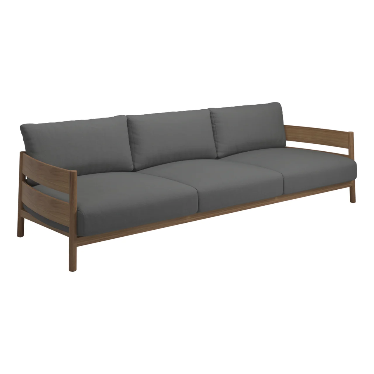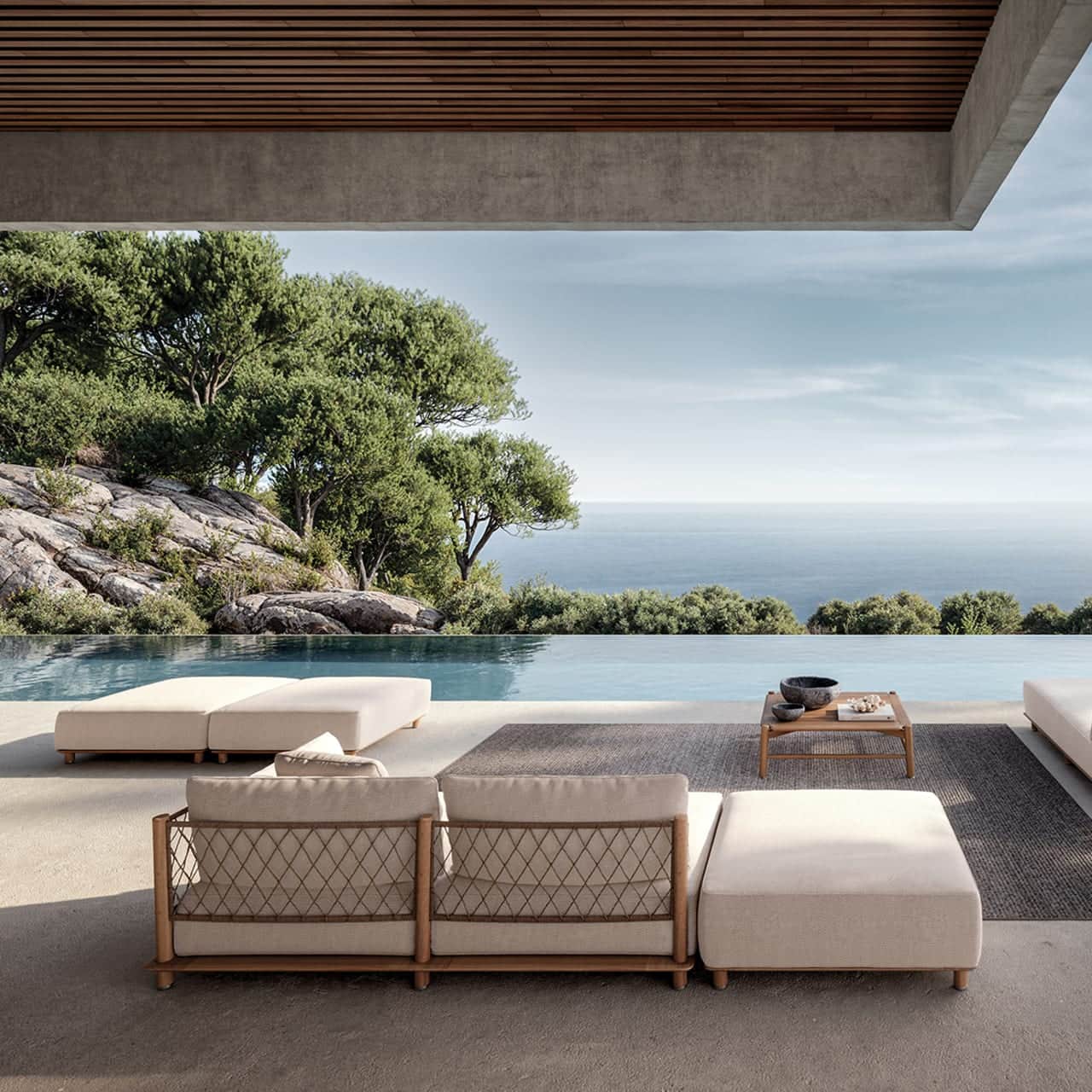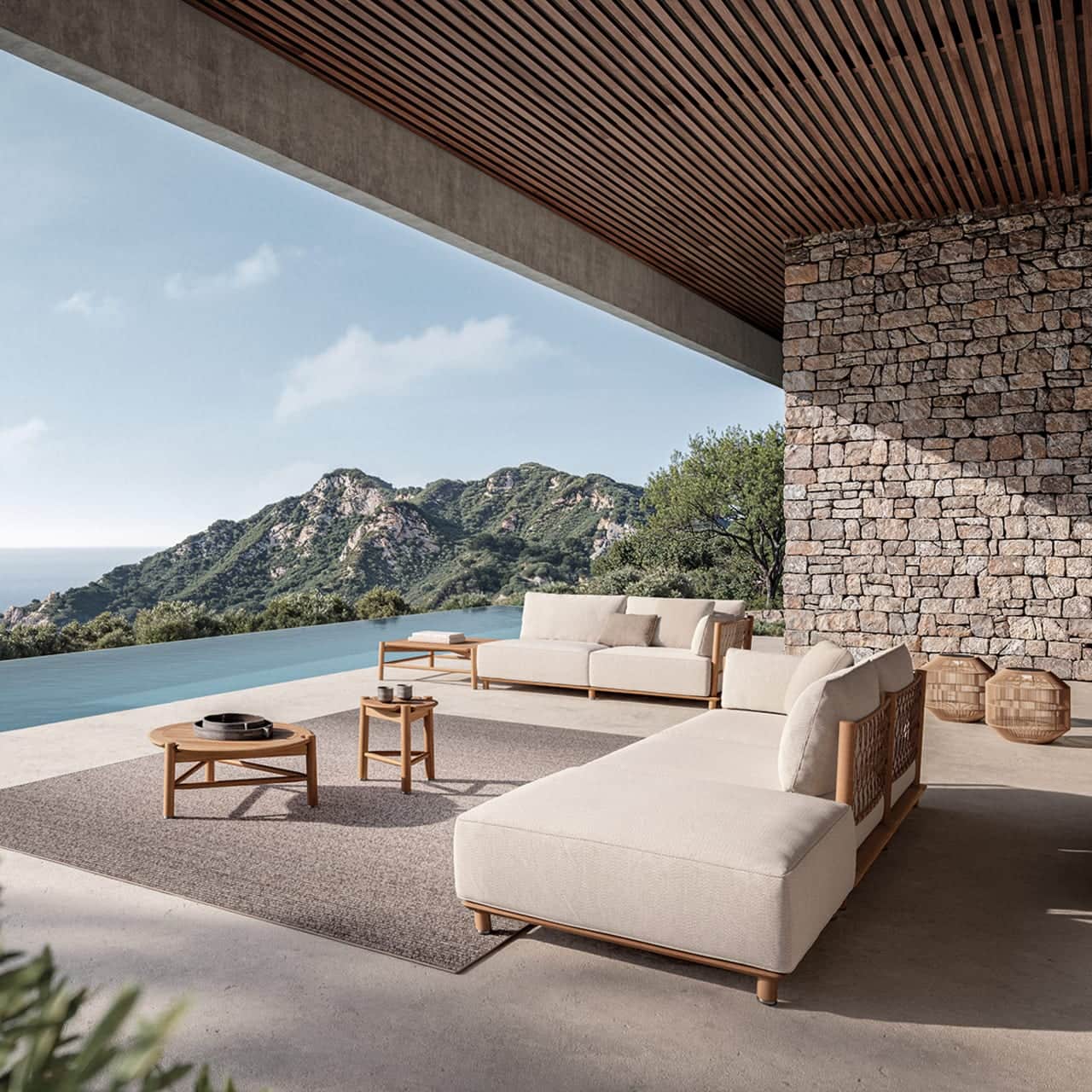 Teak outdoor sofas are a rustic option for ski lodges, as well as high-desert escapes where the warmth of teak is complemented by the soft ruddy colors of sun and earth. The popular DEDON TIBBO collection features turned teak armrests, feet and frame elements, giving the outdoor sofa a sculptural refined indoor look.