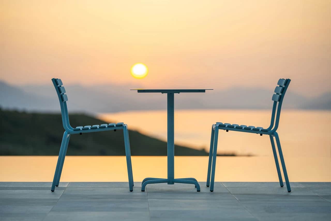 Aluminum and synthetic sling are also favored by those in search of a chic chair. These materials are lightweight and easy to clean, making for elegant and airy patio chairs. If you prefer a vintage look, synthetic wicker or rope bistro chairs, like those in the POINT Charleston collection, evoke the classic seaside charm of old-world hotels while benefiting from the convenience afforded by modernized materials.