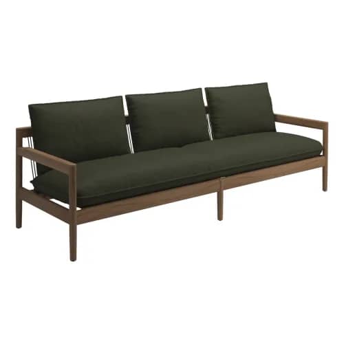 When imagining Saranac, Mark Gabbertas visualized a design that combined exceptional comfort with an enduring aesthetic. Turned contoured teak elements suggest a refined indoor feel, but the sustainably sourced materials, including teak, synthetic rope fiber, and the luxurious cushions, are all designed to stand up to any outdoor weather conditions, ensuring this lounge collection, which includes some sofas, will retain its natural charm for many years to come.Â