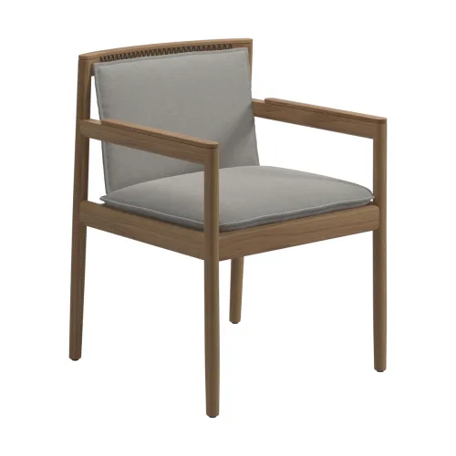 Saranac is the spiritual successor to Gloster's iconic teak collections Bay and Loop, but establishes a unique identity with extra flourishes, including rounded arms and rope strung around the back frame.