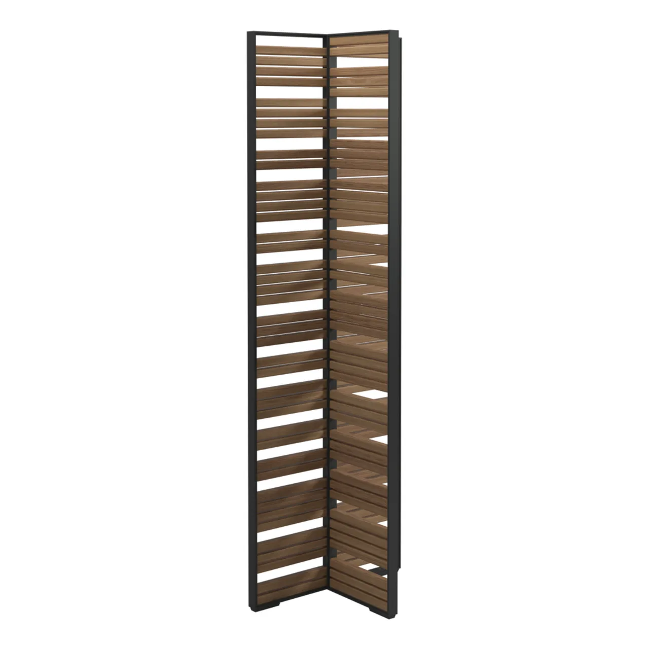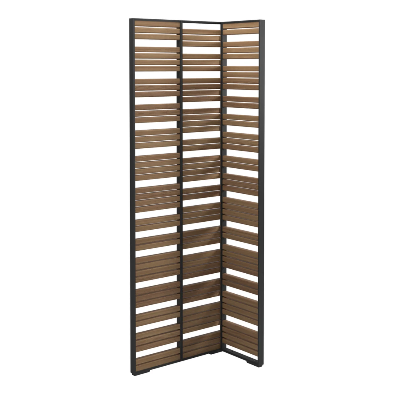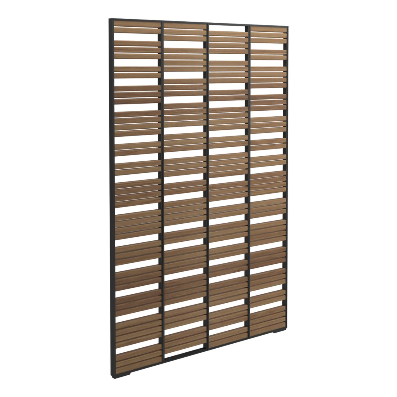 Each screen showcases a smooth, durable powder-coated aluminum framework which holds varying slats of natural teak, inducing warmth and serenity to your environment.