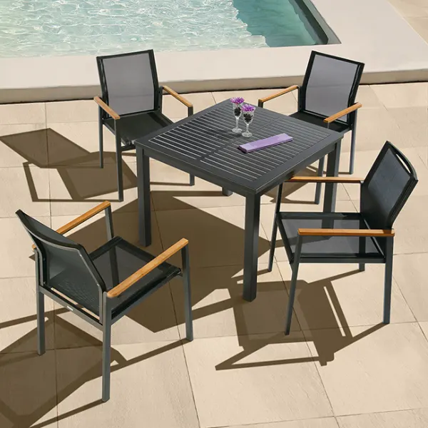 The Aura dining chairs utilize Textilene® sling in up to five different colors: charcoal, platinum, titanium, pearl, and champagne. The armrests are accented with teak, rounding out the comfy feel of the line and adding to its character.