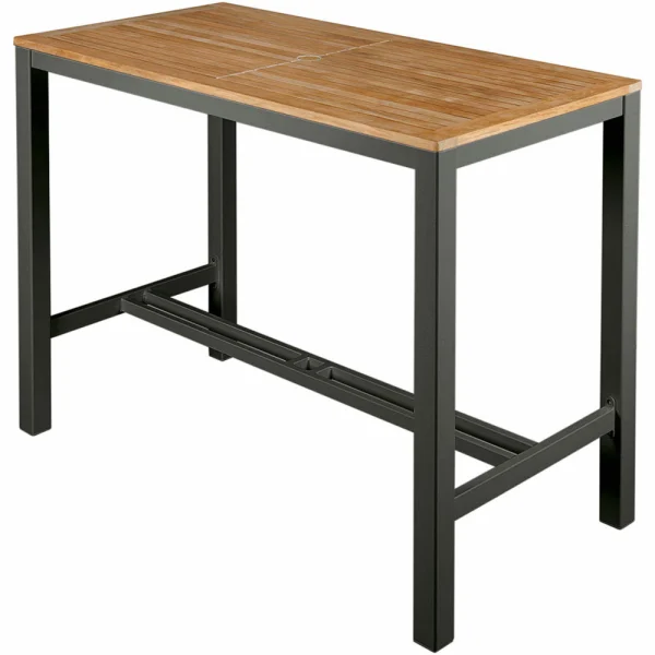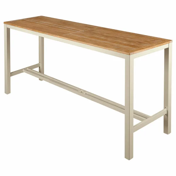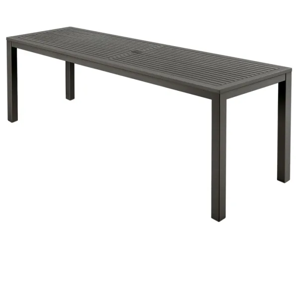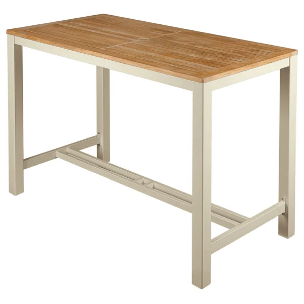 With the Aura high-dining and counter-height dining tables, you may choose among powder-coated aluminum frames in three different finishes with slatted plantation-grown teakwood tops. Should you prefer light furniture with a modern touch, then go for all powder-coated aluminum tables (frame and top) in the same finishes—arctic white, champagne, graphite—to mix and match colors. The dining teak tabletops have a thread of aluminum running across it and around the parasol hole; the latter can be hidden by a supplied teak plug if not in use.