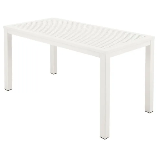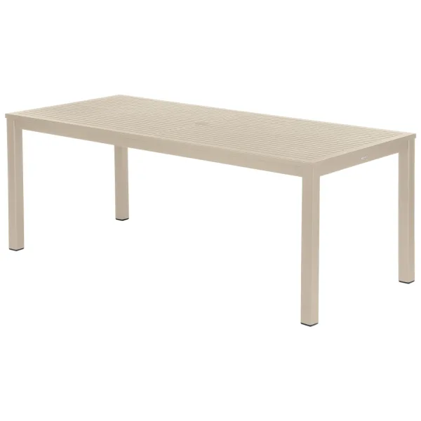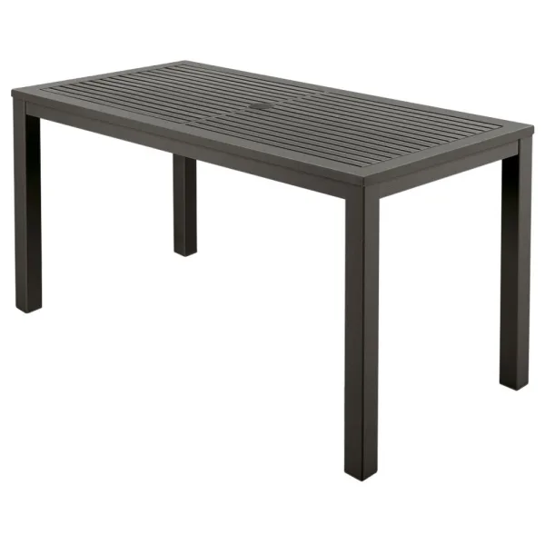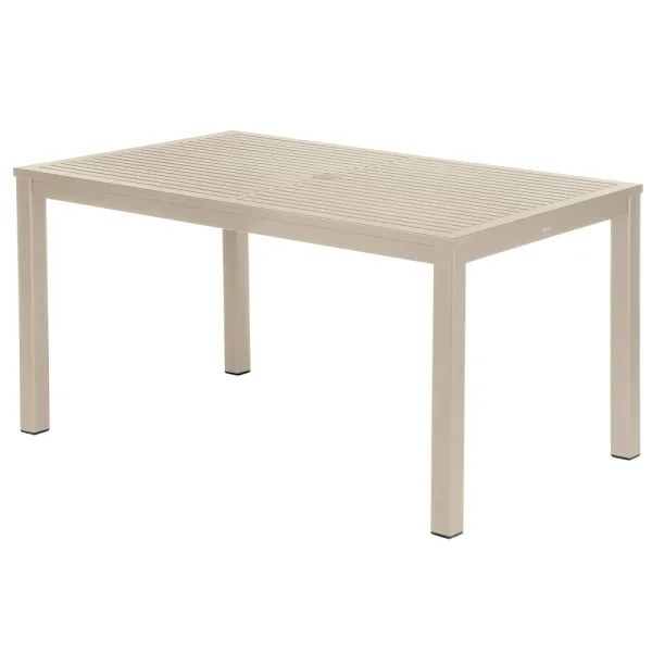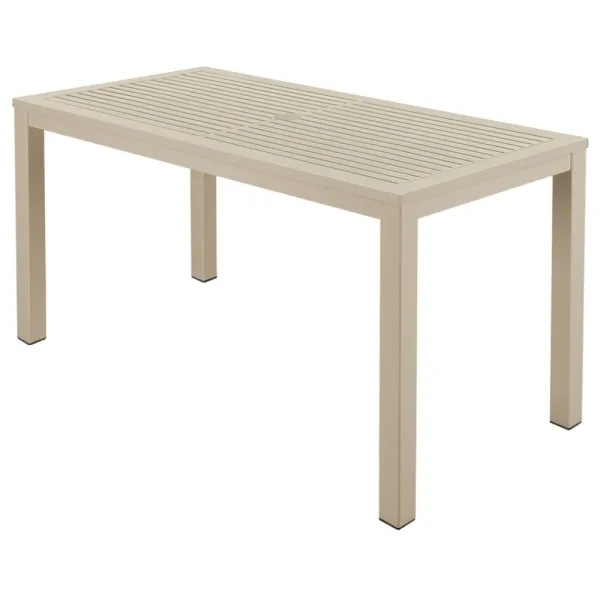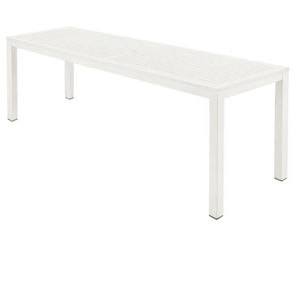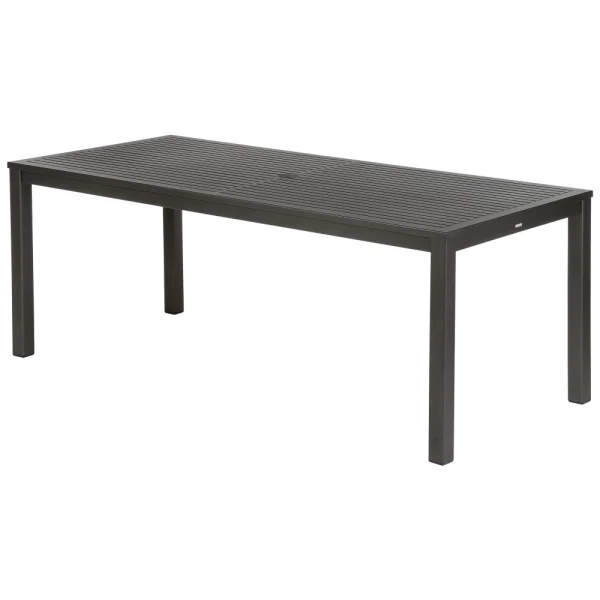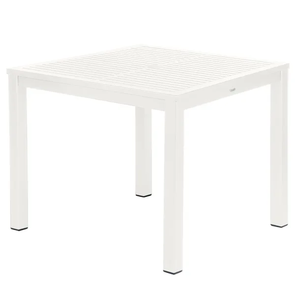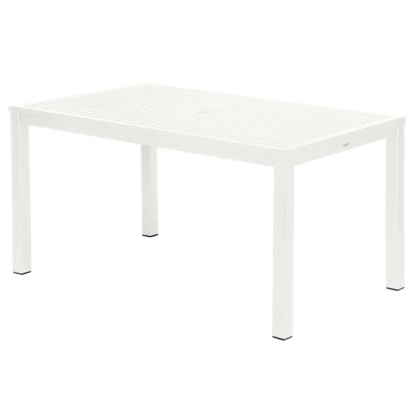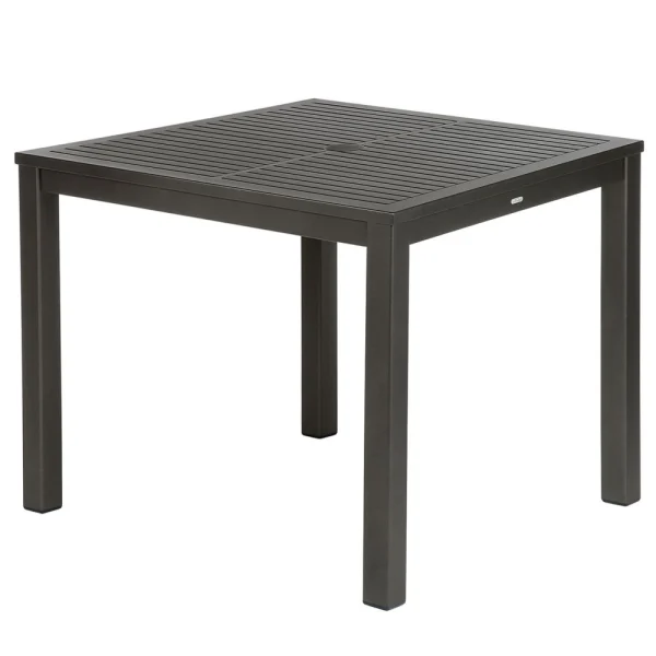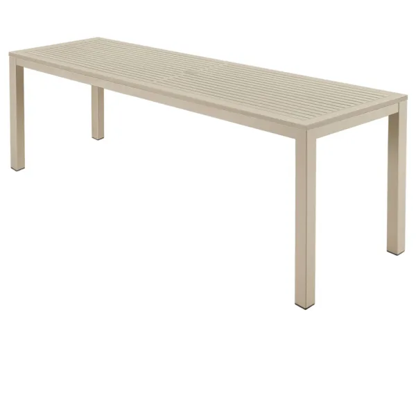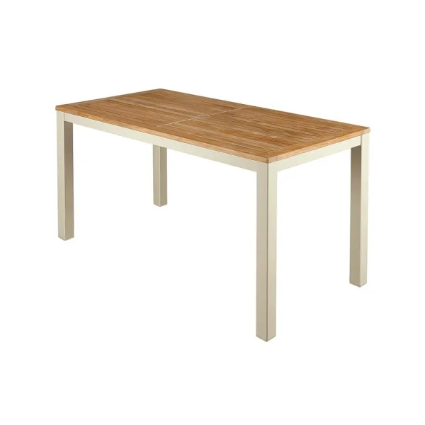 With the Aura tables you may choose among powder-coated aluminum frames in three different finishes with slatted plantation-grown teakwood tops or if you prefer light furniture with a modern touch, then go for all powder-coated aluminum (frame and top) in the same finishes—arctic white, champagne, graphite—to mix and match colors. The dining teak tabletops have a thread of aluminum running across it and around the parasol hole; the latter can be hidden by a supplied teak plug if not needed.