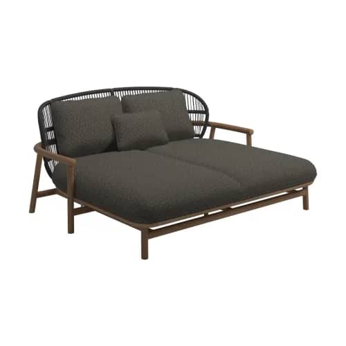 Teak outdoor daybeds tend towards prominent platforms and a classic look, but, when combined with aluminum, assume a sophisticated, lighter profile. Gloster's Mistral is an excellent example of a modern teak outdoor daybed.