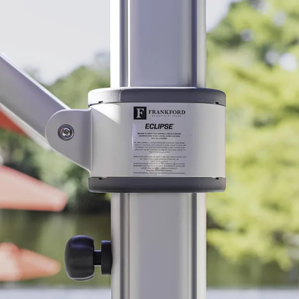 There are other standard features that make Eclipse the ultimate choice for outdoor living, e.g. its smooth and easy crank lift, a commercial tilt locking system, extruded aluminum mast and joints, single vent, and a protective cover. The crank is removable, which our commercial customers or families with kids will appreciate. The commercial tilt locks into place in one of three positions for easy handling. Every Eclipse cantilever umbrella is delivered with a black polyester protective cover (free) or you may upgrade to a 9 oz. acrylic cover in matching color (upcharge).