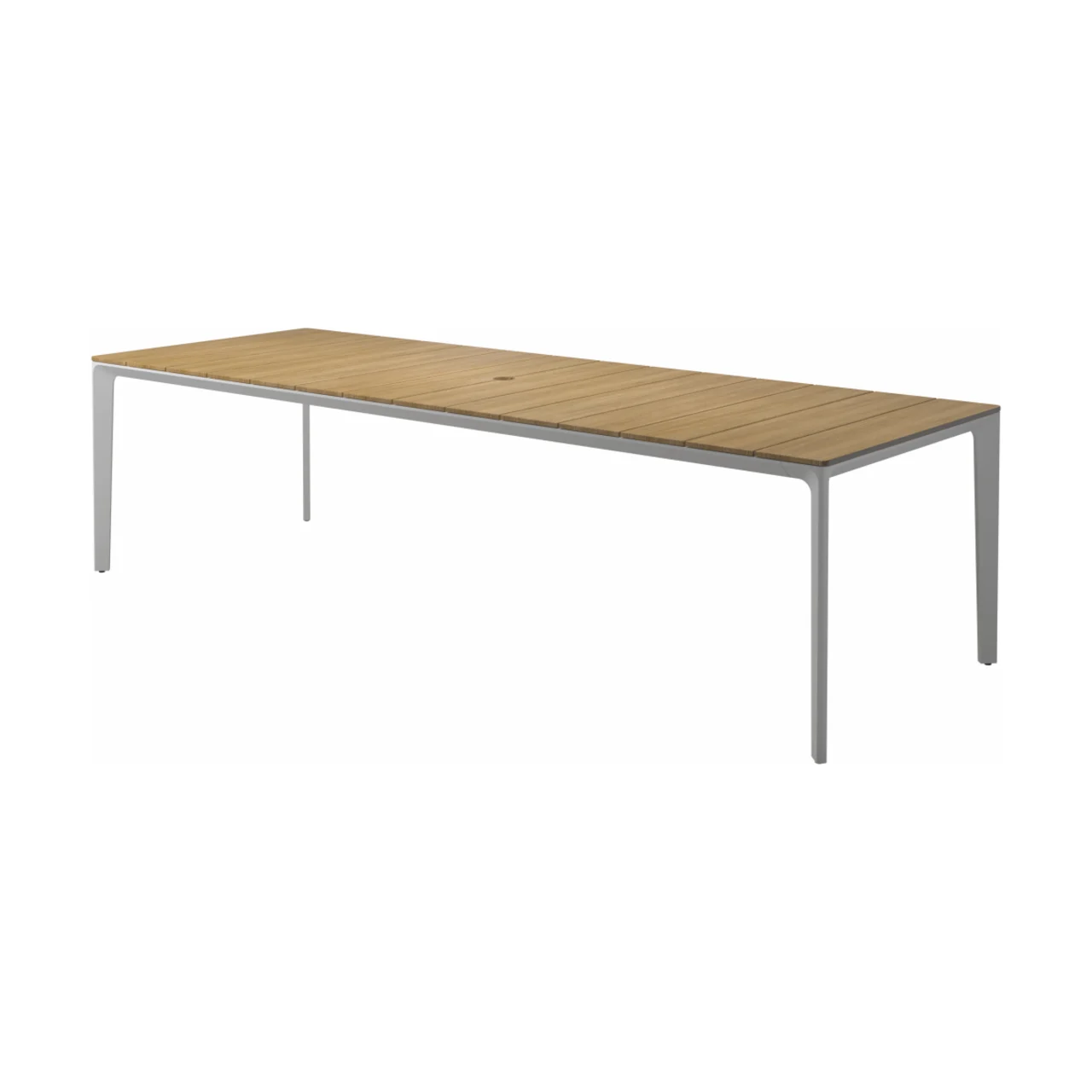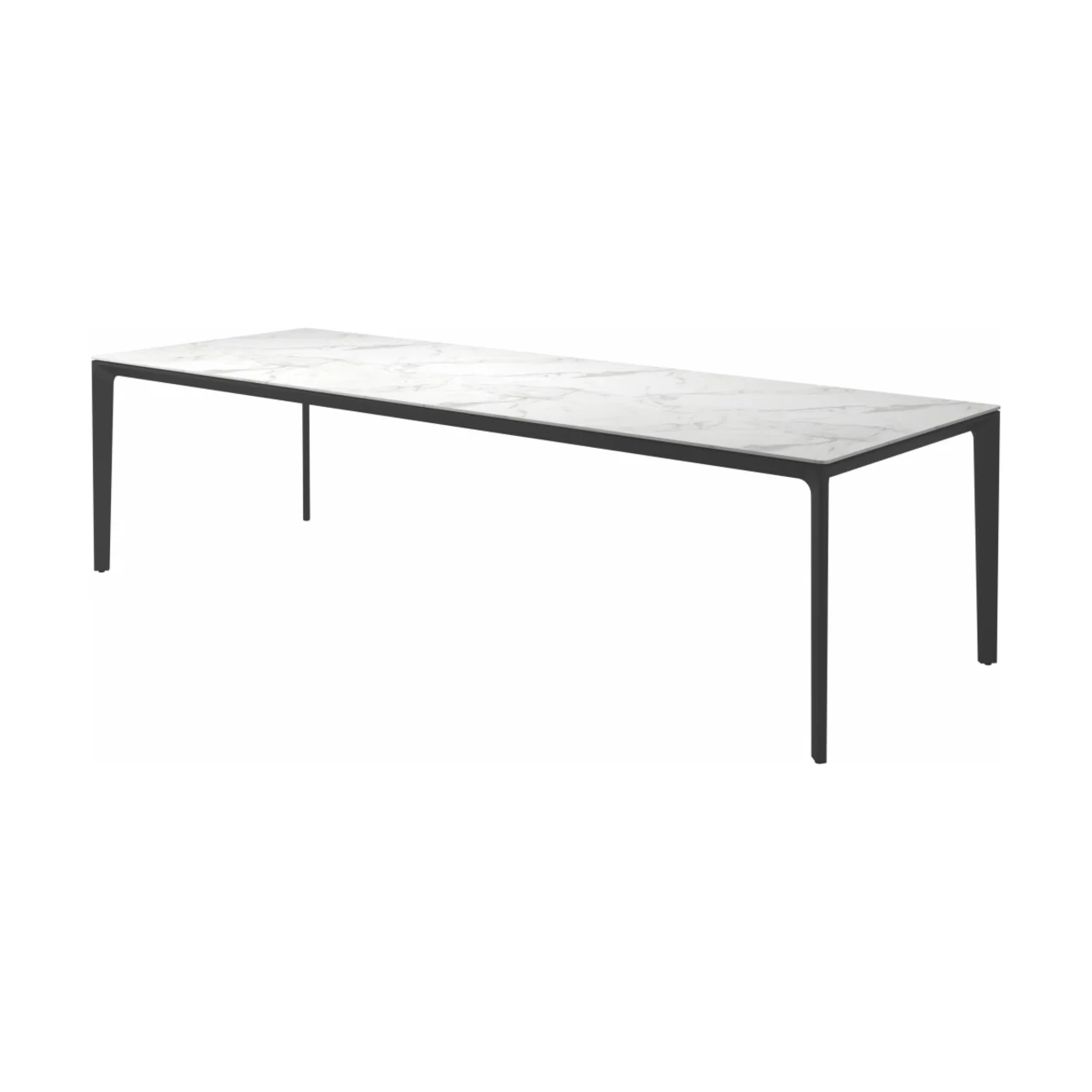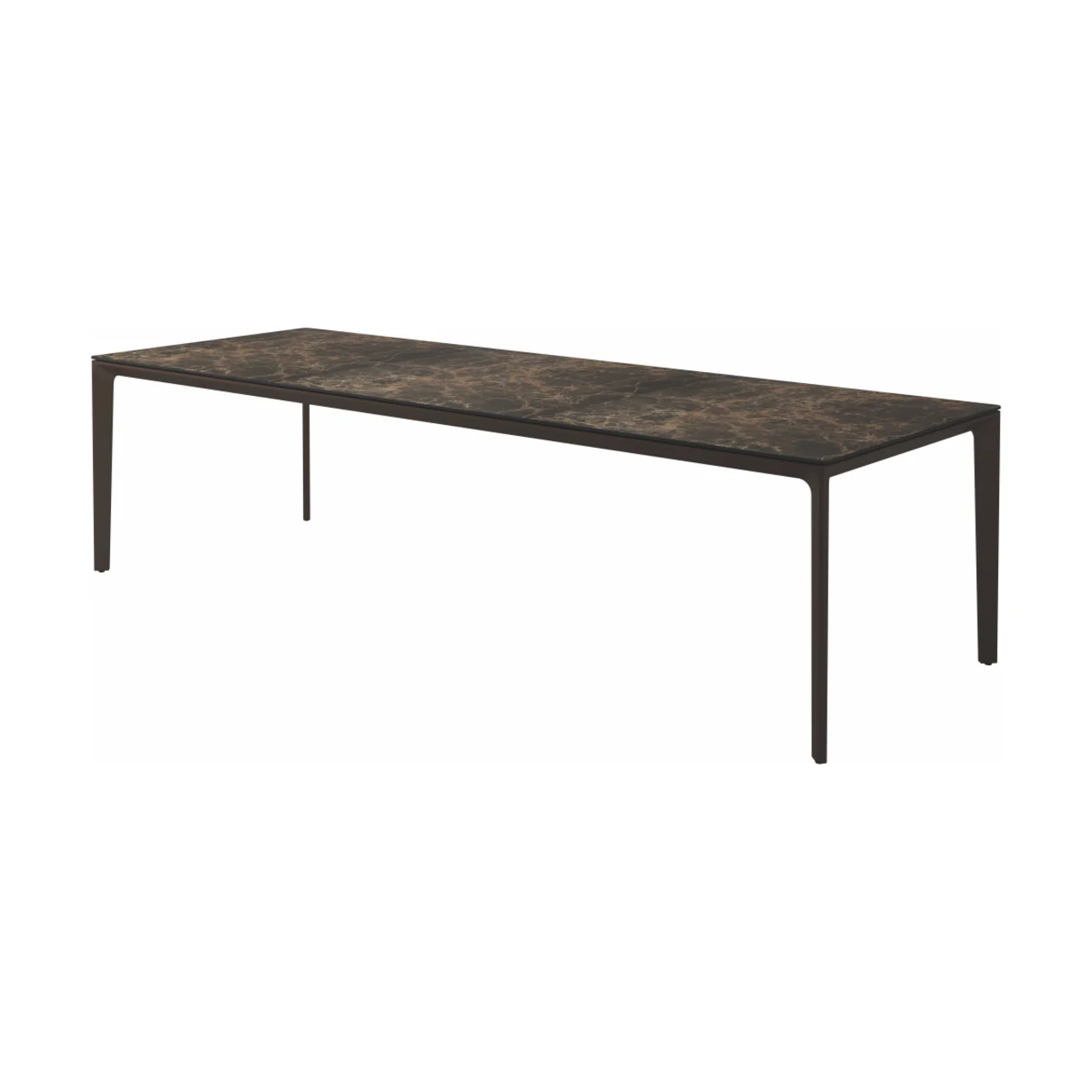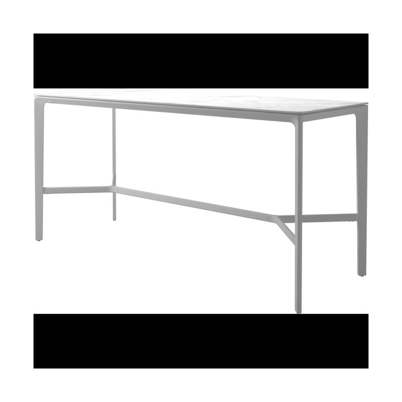 Carver tables are offered in three different lengths ranging from 35 to 110 inches, seating four to ten people. The powder-coated aluminum frame is available in white and meteor color and harmonizes with each of the ceramic top as well as with the natural-finished teak top. A brown colorway also features limited availability. Contact customer service for details.