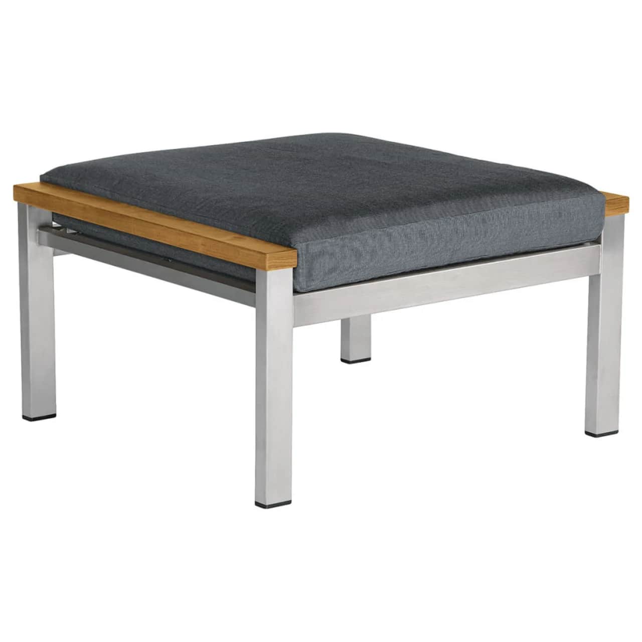 This lounge collection features stainless steel construction in smooth lines and extraordinary design. This deep-seating collection features teak and stainless steel construction, clean lines, and extraordinary style. All-weather seat and back cushions are comfortably thick, yet neatly tailored for a crisp, modern look that goes anywhere—indoors or out.Â