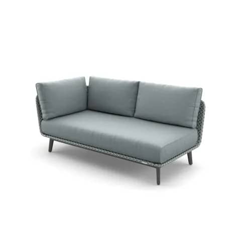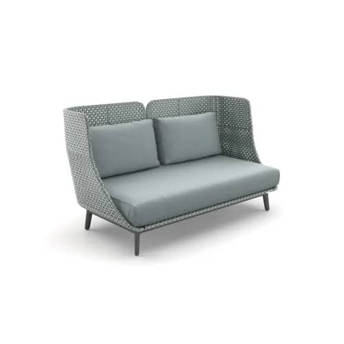 MBARQ is a versatile outdoor seating system comprising sofa modules, daybed modules and a footstool. The collection is characterized by deep cushions and a choice of organically shaped backs in different heights. A semi-transparent, triaxial weave of DEDON Fiber wraps you in a colorful mosaic. Working with three different colors of fiber, Herkner and renowned color specialist Giulio Ridolfo have taken a textile approach to the weave, creating a playful yet sophisticated color world. With a powder-coated aluminum frame in a choice of Terracotta, Nori or Lipari, MBARQ is light, strong and extremely weather-resistant.