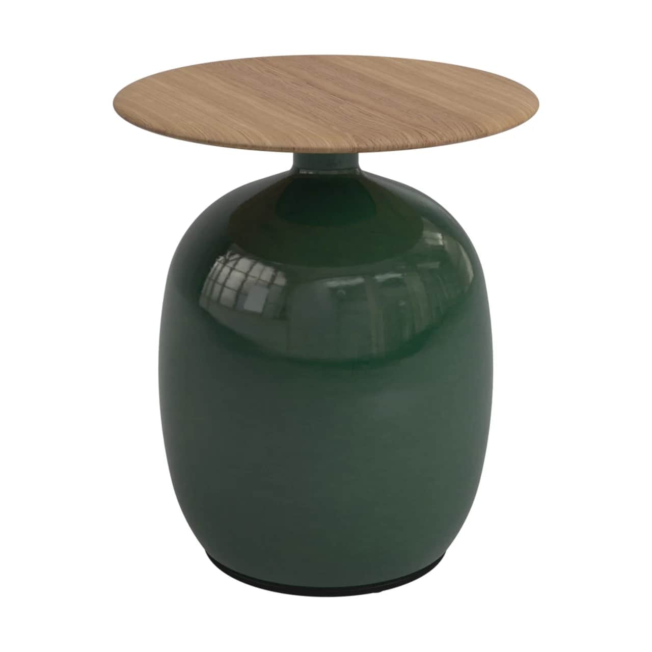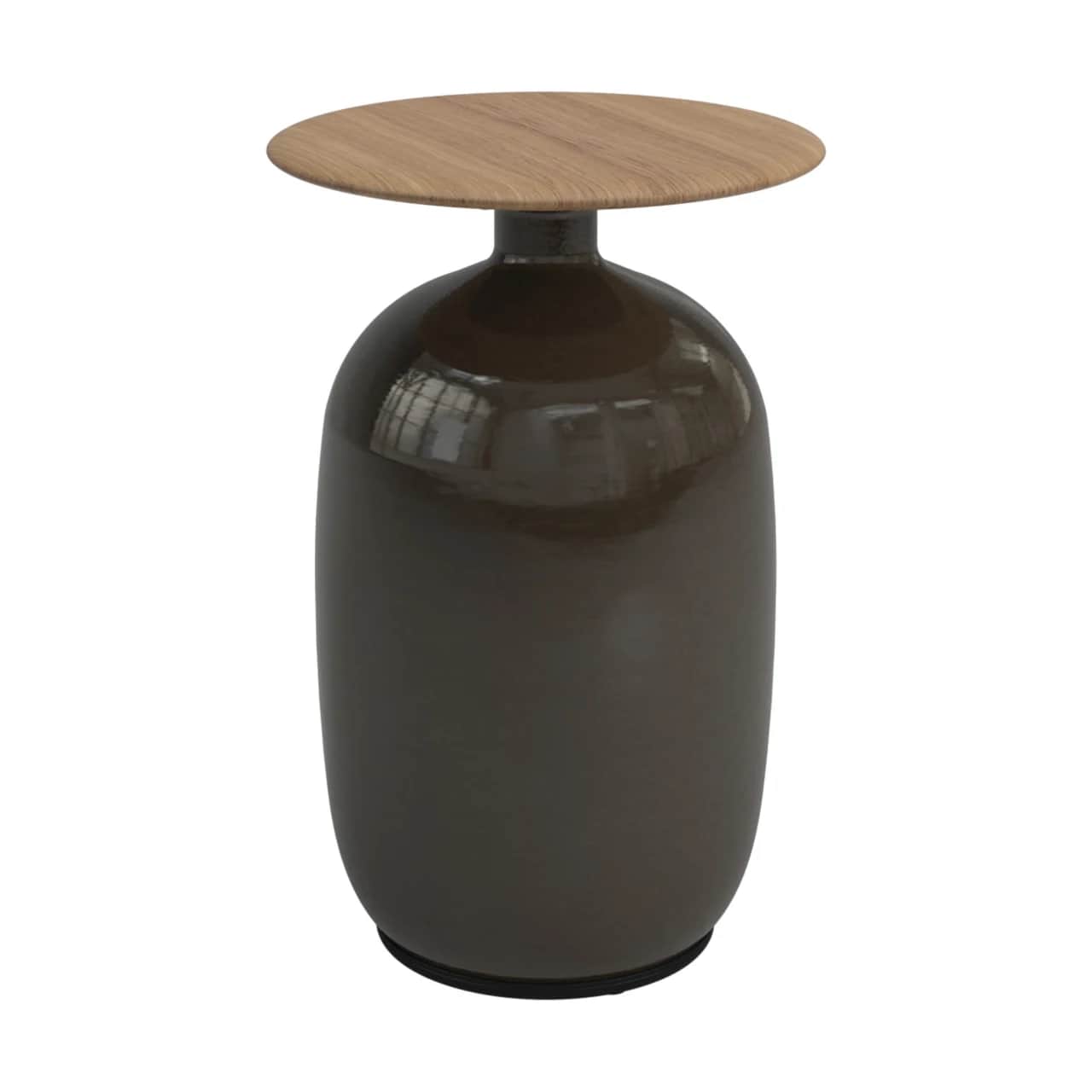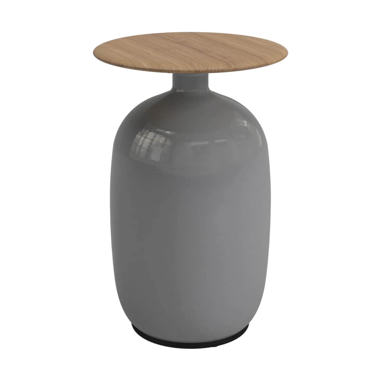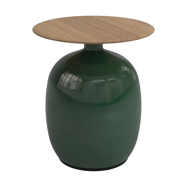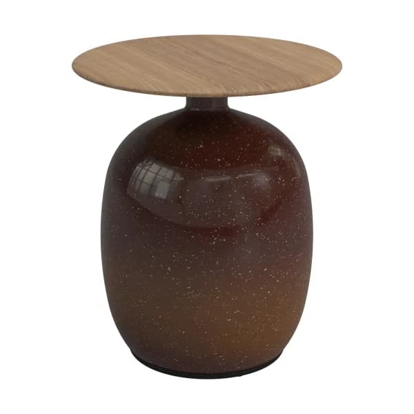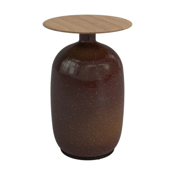 The vertically shaped base is made out of glazed ceramic and is topped by a natural finish teak table top. Teak is the most valuable tropical hardwood in the world. It was brought to Indonesia by the Buddhist monks from Burma in the 16th century and is in high demand. Teak is mainly used for luxury furniture because it can withstand extreme weather conditions and is very stable.