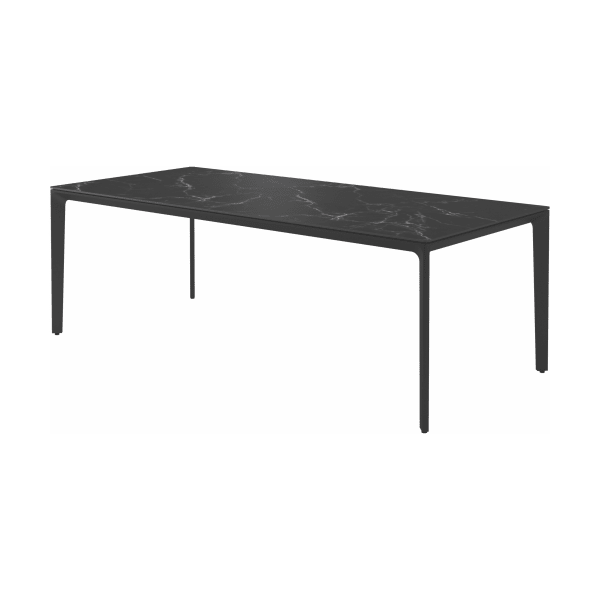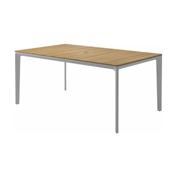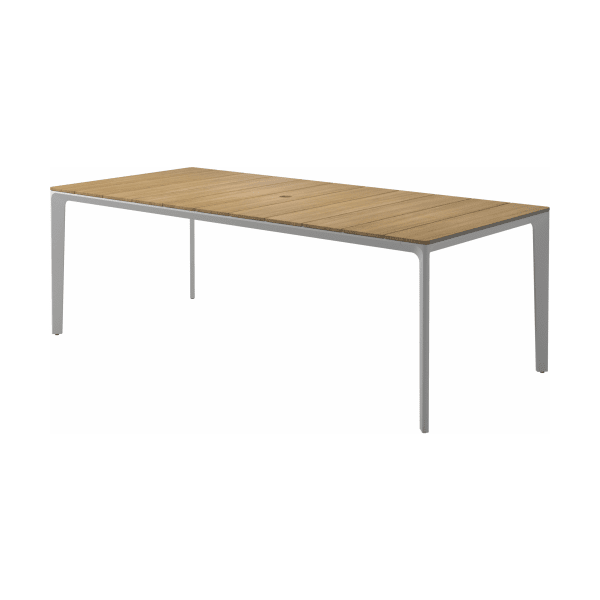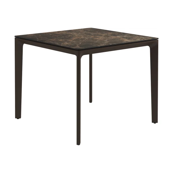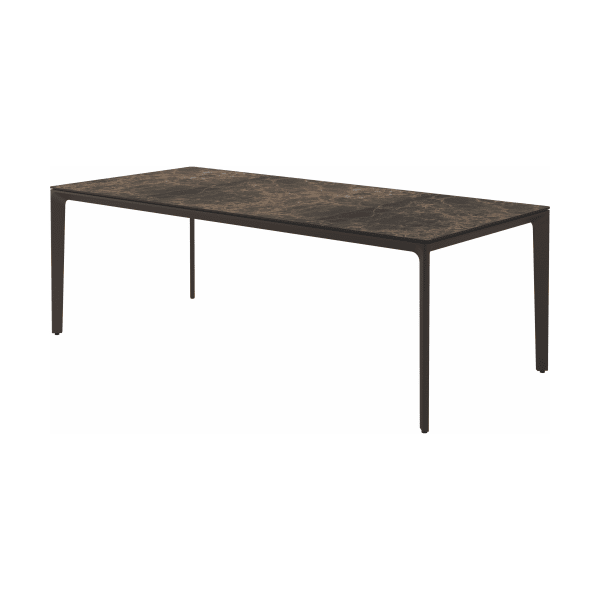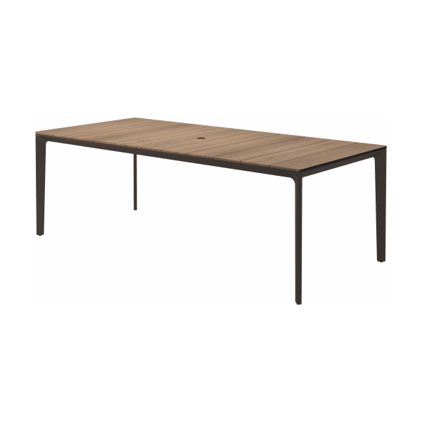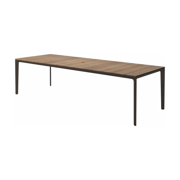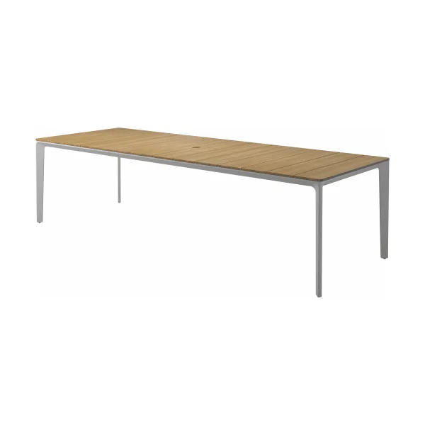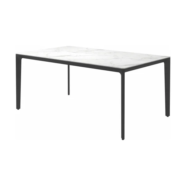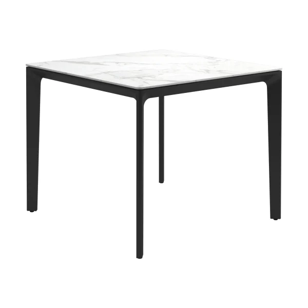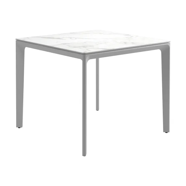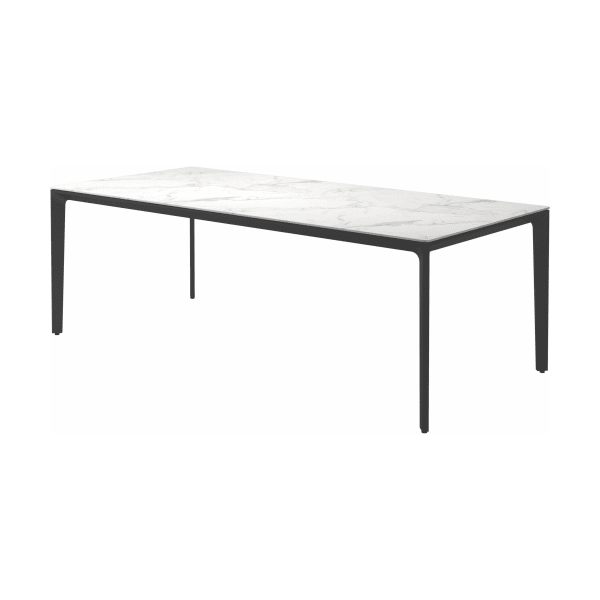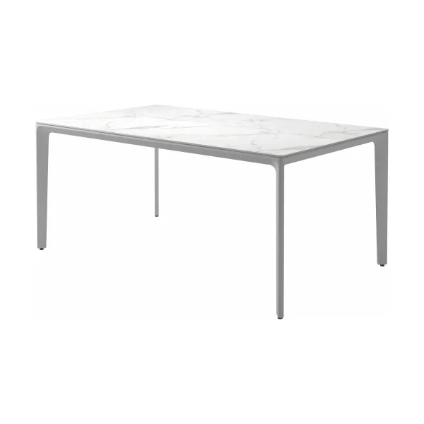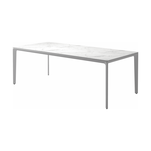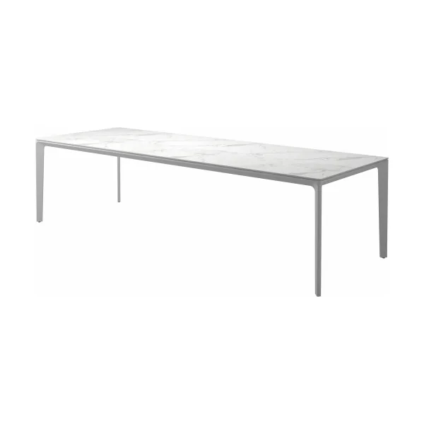 Carver tables are offered in three different lengths ranging from 35 to 110 inches, seating four to ten people. The powder-coated aluminum frame is available in white and meteor color and harmonizes with each of the ceramic top as well as with the natural-finished teak top. A brown colorway also features limited availability. Contact customer service for details.