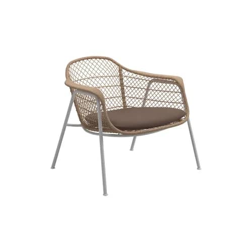 The all-weather wheat-colored wicker is woven in an airy cross-hatch pattern which gives outsize stature to the chairs, in addition to adding a natural feel and visual accent to the clean whiteness of the other elements. Woven furniture can be left outside all year round and is able to withstand temperatures from -4°F to +131°F.