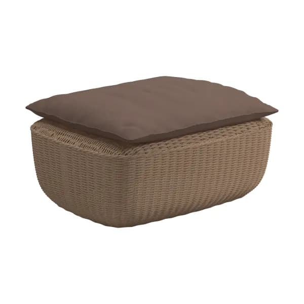 Designed with the principle of 'less is more' in mind, Omada revels in timeless simplicity and unequivocal comfort. The gently contoured body of the chair and ottoman are woven in wheat-colored textured wicker and include luxurious full-length all-weather cushions, leaving nothing to distract you from enjoying your leisure time.