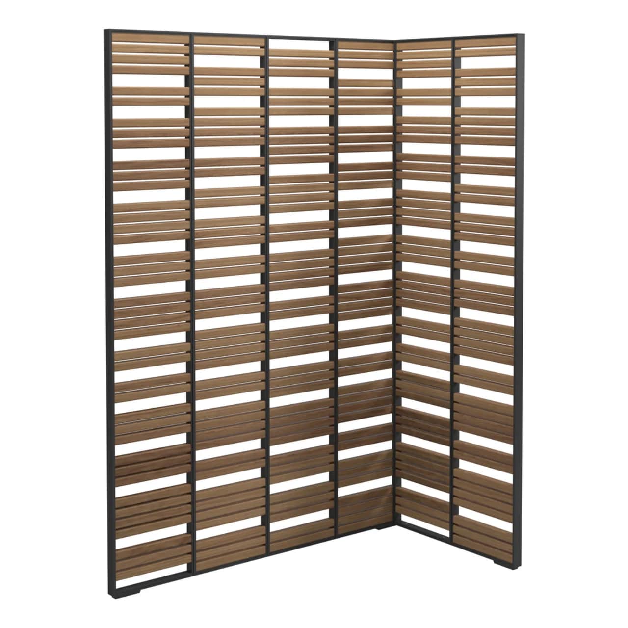 Each screen showcases a smooth, durable powder-coated aluminum framework which holds varying slats of natural teak, inducing warmth and serenity to your environment.