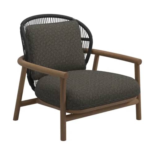 Teak wood is a classic choice for frames, seats, and other design elements, due to its old-world charming beauty, its easiness to maintain (especially when left untreated, it develops a timeless silver-grey patina prized by teak owners), and its imperviousness to rot and warping in bad weather owing to its naturally high oil content. Teak outdoor furniture is often designed specifically for parks and gardens like the classic teak Adirondack armchair from Barlow Tyrie, or the Archi lounge chair from Gloster. Cushions and pillows can make the natural feel of teak a little cozier.