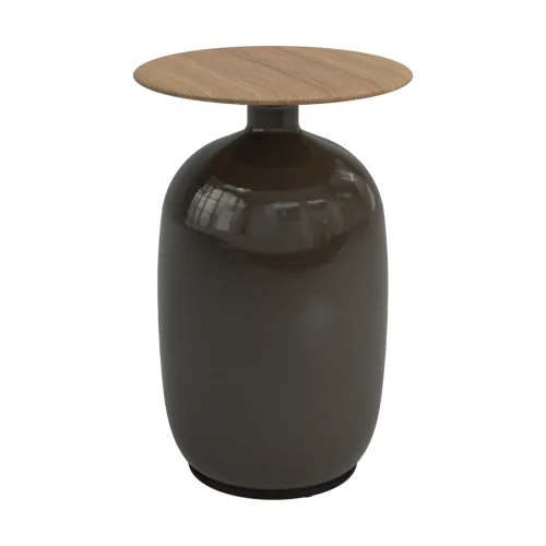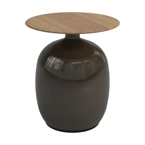 Finally, your side table should match the height of the surrounding lounge furniture. Sofas with armrests typically require something taller, like Gloster's Blow Round High Side Table, which features a handmade glazed ceramic base and round teak top. Chaise lounges and sunbeds are typically low to the ground and pair with short tables, like Mamagreen's Ekka Side Table.