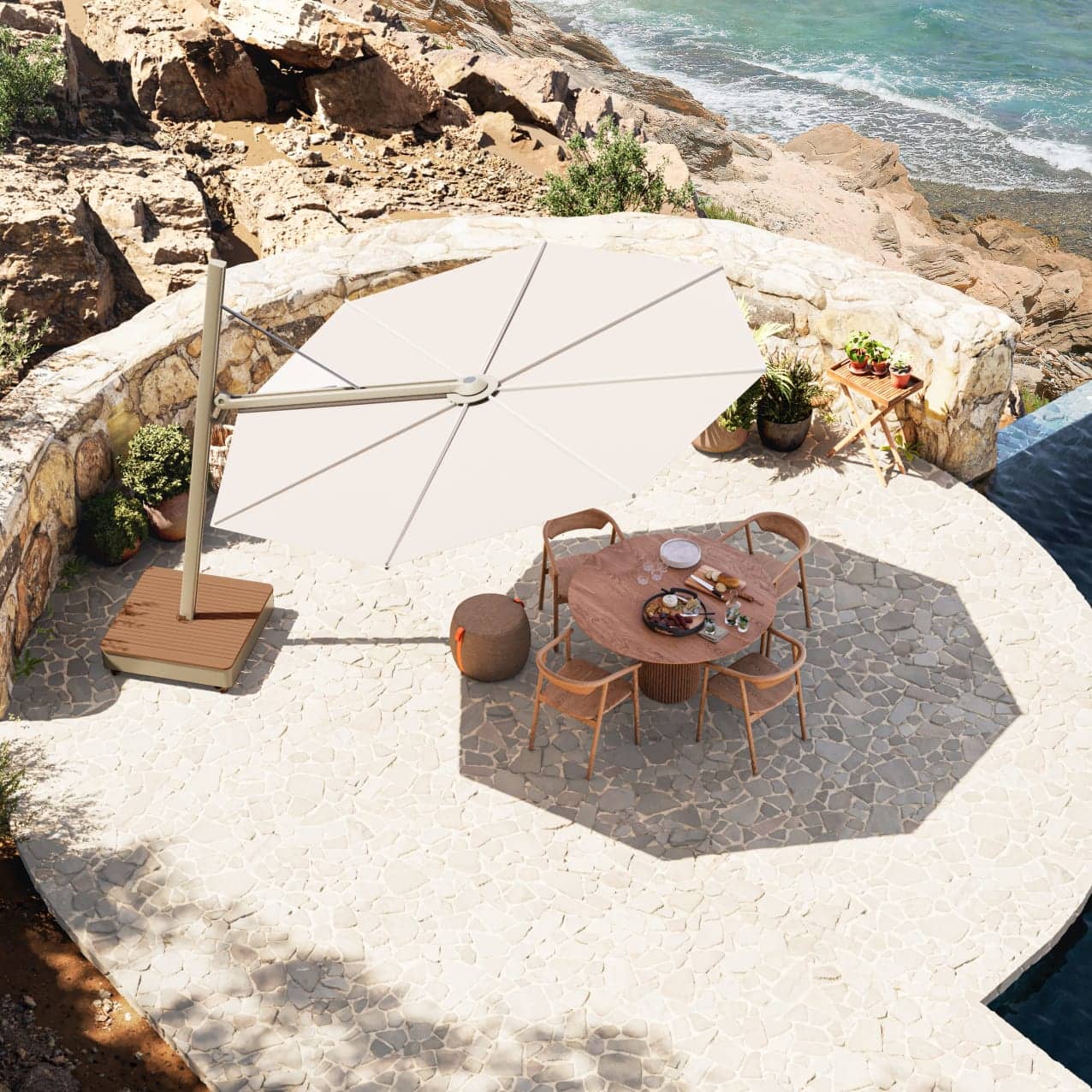 A rotatable workhorse all-American cantilever umbrella with Infinity Tilt canopy for maximum maneuverability of shade.