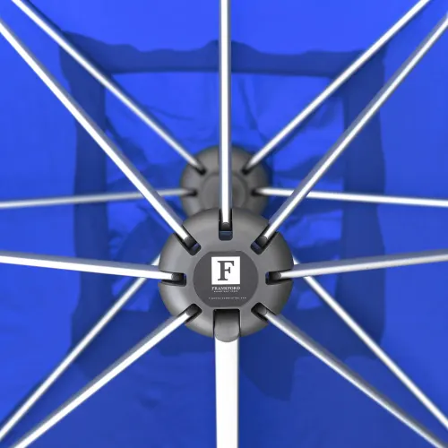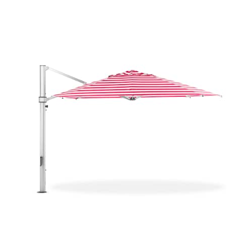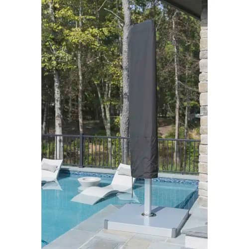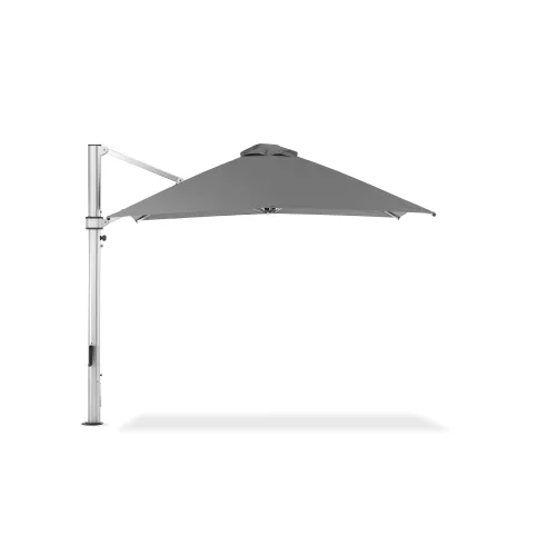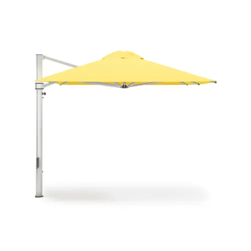 In this style, the mast is structurally removed to the side of the canopy. This inverted L-shaped support makes the canopy more maneuverable on multiple axes for improved shade coverage and directional shade throughout the day. Some cantilever umbrellas can be mounted directly to a wall, without the need of a heavy weighted base.