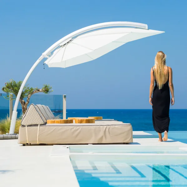 The leaf-shaped Icarus UX umbrella is unique in all its aspects. The parasol stands out because of its shape, elegance and extreme wind resistance. Thanks to the built-in rotating mechanism, the parasol rotates 360° around its axis, allowing you to create shadow wherever you want. If you position the canopy vertically, you are completely sheltered from the wind. The design team has focused on sustainability and ultimate ease of use, with all parts being sourced locally. The height of the leaf can be easily adjusted and installation is extremely simple.