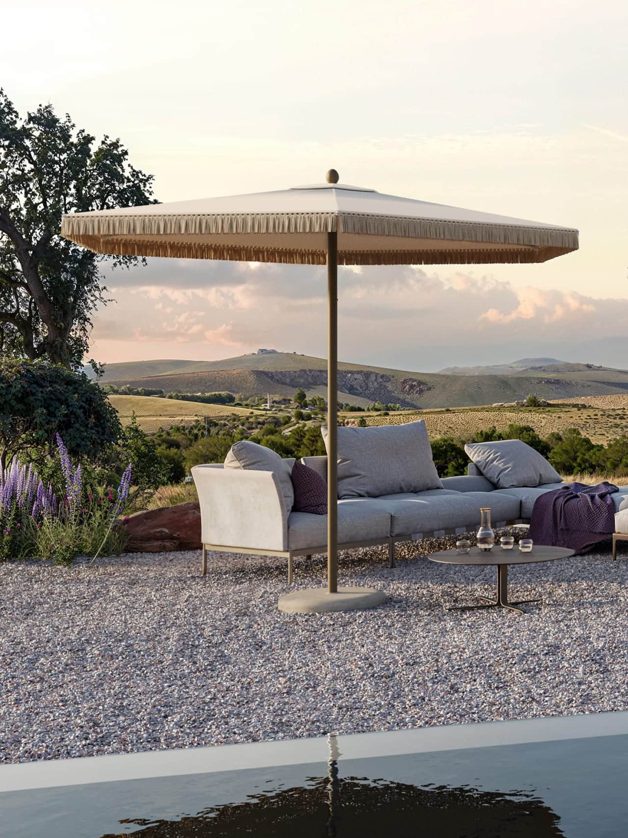 The Nata central post parasol is a sophisticated and user-friendly addition to any outdoor environment. With its simple design, this parasol offers a timeless aesthetic that perfectly suits both small and large projects. Whether you want to create a cosy corner in your garden or shade a spacious patio, the Nata parasol is ready to meet all your needs. Easy to open and a push-to-tilt-feature allows elegant shade control as the sun moves across the sky. The Nata parasol comes in two models: round and square, each in two sizes and two frame colors (Black and Beige Limestone).